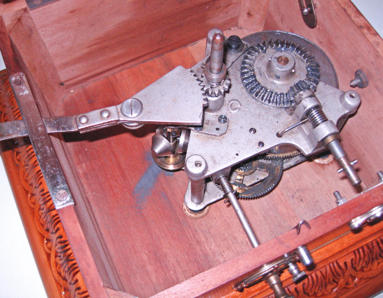 The gentle curve of the back-bracket gives the machine an air of charm. The soundbox/arm assembly on a Pathéphone is infinitely more complex than the equivalent components of a Victor or Columbia. The sound which is produced is truly extraordinary. Pathé discs have a "real," an organic, quality that can only be achieved through the vertical-cut record process, with a permanent sapphire stylus.