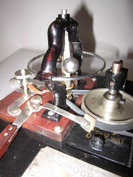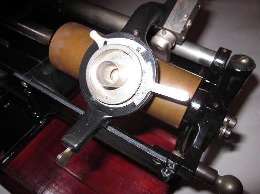 Edison made a policy of encouraging the continued use and effectiveness of his Phonographs, no matter how early. The fact that this machine still plays today demonstrates how the concept of keeping Edison Phonographs running was based on a solid footing. At some point, the owner of this particular Class M "up-dated" the reproducer carriage, by deftly removing the little "side arm" that was thought to be necessary to "fine tune" the position of the reproducer or recorder. This arm was subsequently shown to be unnecessary, so the owner removed it. At present, the early "Automatic" reproducer is being held in place by an original, though slightly later-style Edison clip.
