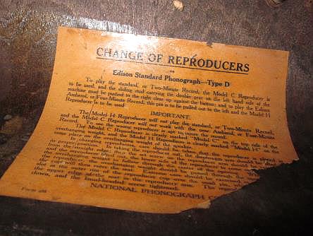To educate the public about the new 4-minute records, and the particular reproducers required to play each type of record, this helpful notice was affixed to the inside of the cabinet lid.
