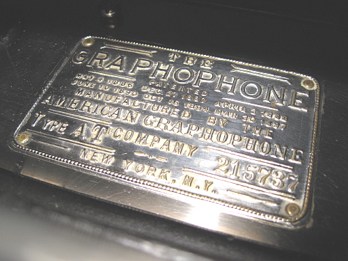 A factory-installed decal from the century BEFORE the last century, and yet fresh and crisp as if it were made yesterday! Note the little gold dot at the center of the cabinet, above the first "O" in "Graphophone." This ephemeral little jot was used at the Graphophone factory in Bridgeport, CT, to assist in locating and applying the banner decal to the cabinet. It was not meant to last, and in most instances today it can no longer be seen. However, this instrument is so pristine that the little factory dot remains!