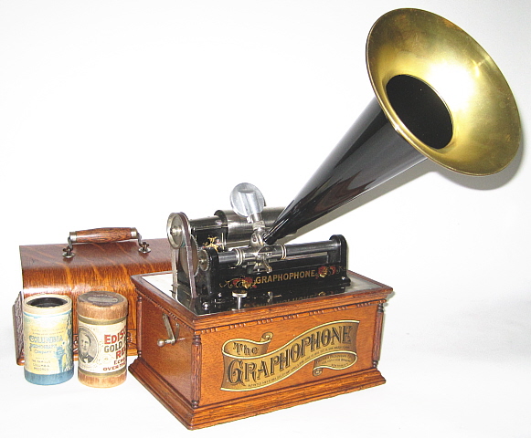 In the late nineteenth century the American Graphophone Company, and its sales outlet the Columbia Phonograph Company, were springing (pun intended) forward. And they were virtually unstoppable. Edison had failed to offer competitive products until the Columbia had eaten most of his lunch! For Christmas 1898, Columbia introduced a beautiful new model, designated the "AT," in an ornate oak cabinet with Victorian carving and a stunning gold banner.