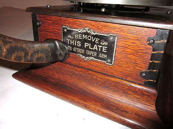 This machine is actually quite a rarity. Here's the reason why -- as Victor evolved its models, they switched from the original "front-mounted" configuration to a "back-mounted" design, where the horn was suspended over the top of the cabinet. This little plate is evidence of the intention of the company to offer the Royal with a "Taper Arm" backed-mounted horn arrangement. The historical importance of this, however, is that THE VICTOR COMPANY NEVER IN FACT ISSUED THE ROYAL WITH A "TAPER ARM." The use of this particular plate must have been extremely limited, only for a short period of time, making this a very rare artifact!