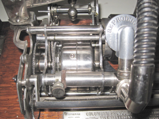 It takes a minute to settle in that this sparklingly crisp coin-operated instrument is from the century before the last century! From mid-1898 to mid-1899 the Columbia Phonograph Company offered its Type B (or "Eagle") model Graphophone with a highly polished nickel finish. From catalog entries we know that this unusual version was called the Type BXP -- "P" for "polished." Normally the Eagle had more of a "brushed nickel" look. Needless to say, this feature that required extra plating and lots of extra hand work did not last long. A small percentage of these ultra-deluxe finish components were used to construct coin-ops. Today, they are impossible to find. However, you are looking at one right now! And it isn't just a rarity -- it's in incredibly exquisite condition!