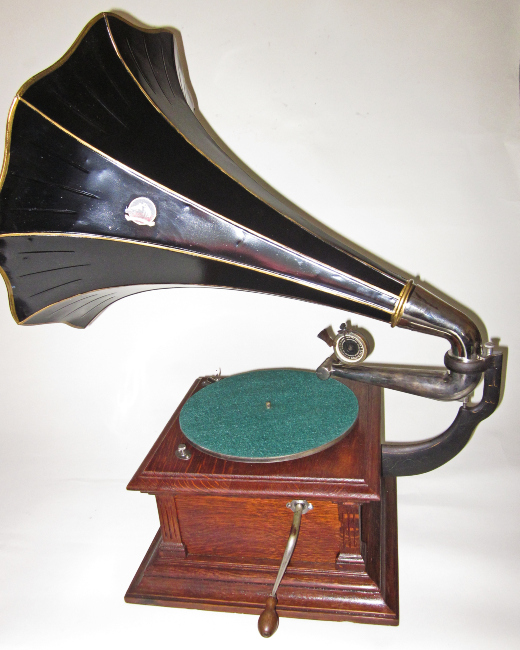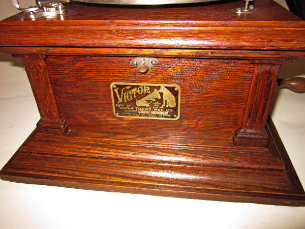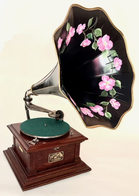 Our Victor III has a pretty oak cabinet with orginal factory finish, and original components which we have meticulouly cleaned, polished. Inside is a sturdy, reliable double-spring motor. We have carefully calibrated this instrument to return it to the condition it enjoyed when it left the factory in Camden, NJ well over a century ago. We carefully restored the original Victor flower horn, complete with beautiful gold highlights and hand painted dogwood blossoms, in precise historical authenticity to the styles of the day.